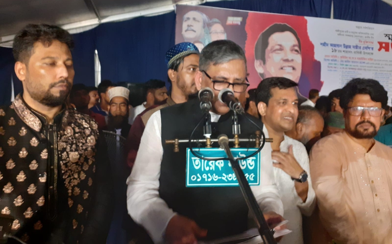 তিনি বলেন, শহীদ আহসান উল্লাহ মাস্টার জীবন দিয়ে গেছেন। তার রক্তের বিনিময়ে আমরা খুনি বিএনপি জামাতের হাত থেকে শেখ হাসিনার নেতৃত্বে গণতন্ত্রকে মুক্ত করতে পেরেছি। আমাদের মনে রাখতে হবে এই বিএনপি-জামাত এখনও শেখ হাসিনার নেতৃত্বে গণতন্ত্রিক বাংলাদেশের যে উন্নয়ন হয়েছে সেটা মেনে নিতে পারছে না। বাংলাদেশের উন্নয়নশীল রাষ্ট্র হিসেবে ঘুরে দাঁড়াক তারা এটা কখনোই চায় না। তাই তারা এখনো ষড়যন্ত্র করছে। খুনি জিয়া ১৯৭৫ সালে বঙ্গবন্ধুকে হত্যা করেছে, সহযোগিদের চাকরি দিয়েছে। খালেদা জিয়া তাদের সংসদে নিয়েছেন। জাতির পিতার হত্যাকারীদের সাথে জিয়া যেমন হাত মিলিয়েছে, তেমনি খালেদা জিয়াও মিলিয়েছে। তাই তো তারা এখন স্লোগান দেয় ৭৫ এর হাতিয়ার, গর্জে উঠুক আরেকবার।